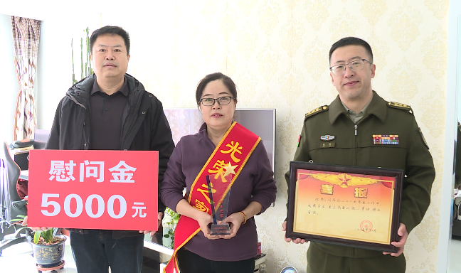 慰问组一行先后来到荣立二等功、三等功的军人家中,为立功军人的家属佩戴上鲜红绶带,郑重递上承载着荣誉的立功喜报和慰问金。