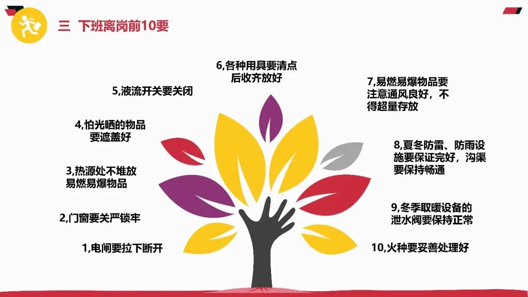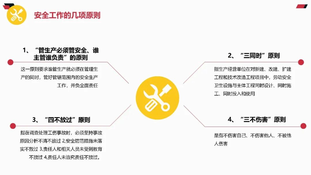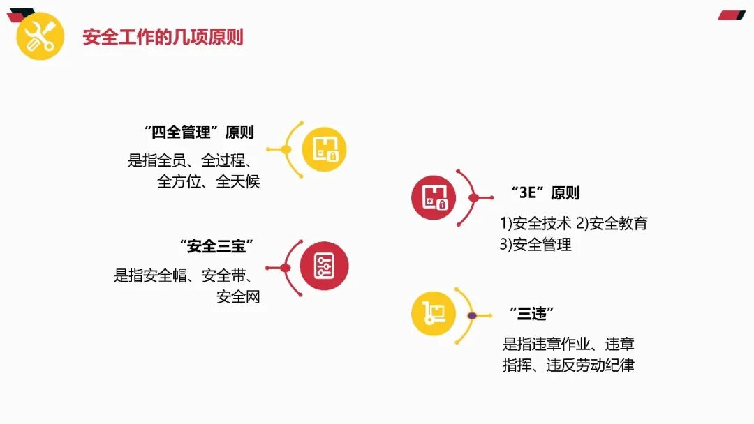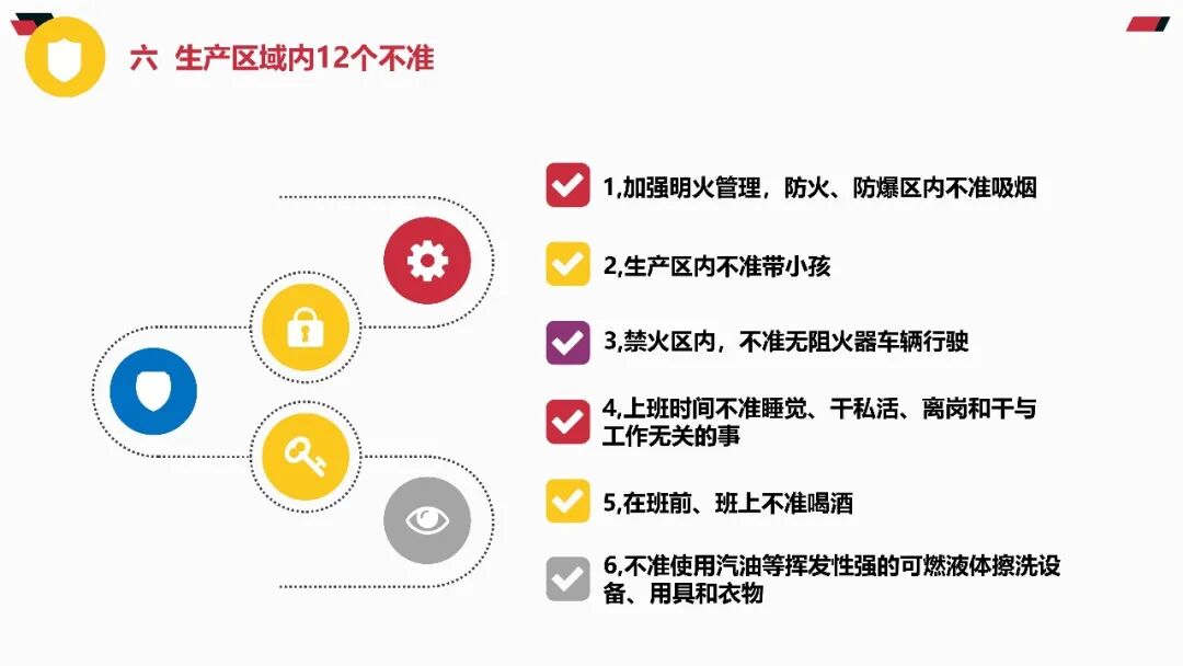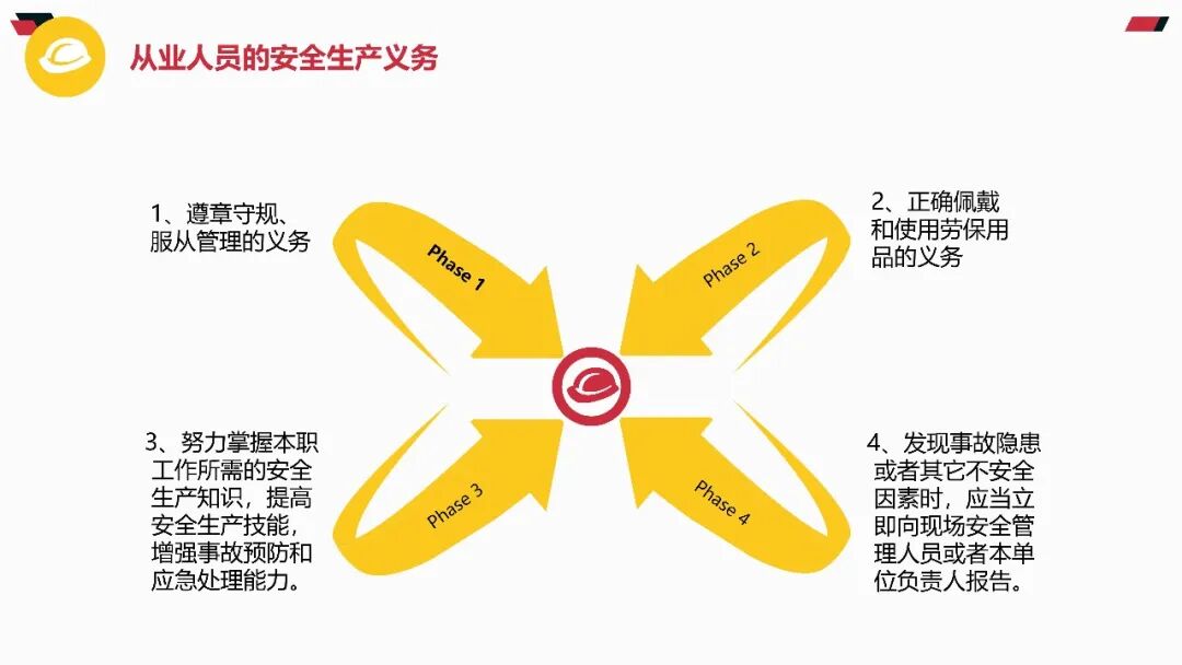 基本方针与原则必须牢记 “安全第一、预防为主、综合治理” 的方针,坚持 “管生产必须管安全”“谁主管谁负责” 原则。企业主要负责人是安全生产第一责任人,需履行建立责任体系、保障资金投入、组织应急演练等法定职责。责任体系与制度安全生产责任制需覆盖全员,从管理层到一线岗位均需明确安全职责。关键制度包括:安全生产例会制度(每月至少1次)、隐患排查治理制度(建立 “台账式管理、闭环式整改” 机制)、教育培训制度(新员工三级安全教育不少于 24 学时)。现场作业安全作业前必须进行风险辨识,落实 “先通风、再检测、后作业” 原则。特种作业(如电工、焊工)需持有效证件上岗,严禁无证操作。高处作业必须系好安全带,动火作业需办理许可证并清理周边可燃物。设备与环境管理特种设备(锅炉、起重机等)需定期检验,张贴合格标志。生产现场保持通道畅通,物料堆放符合 “五距” 要求(墙距、柱距、顶距、灯距、垛距)。消防设施每月检查,确保完好有效,消防通道严禁堵塞。应急处置要点熟记本岗位应急处置程序,掌握灭火器、消火栓等器材使用方法。发生事故立即启动应急预案,优先保障人员疏散,同时向现场负责人和应急管理部门报告。事故报告需包含时间、地点、伤亡情况及简要经过,不得迟报、漏报、谎报。法律与纪律红线严禁违章指挥、违章作业、违反劳动纪律 “三违” 行为,违者将追究责任。《安全生产法》明确规定,生产经营单位发生事故,最高可处罚 2000 万元,构成犯罪的追究刑事责任。