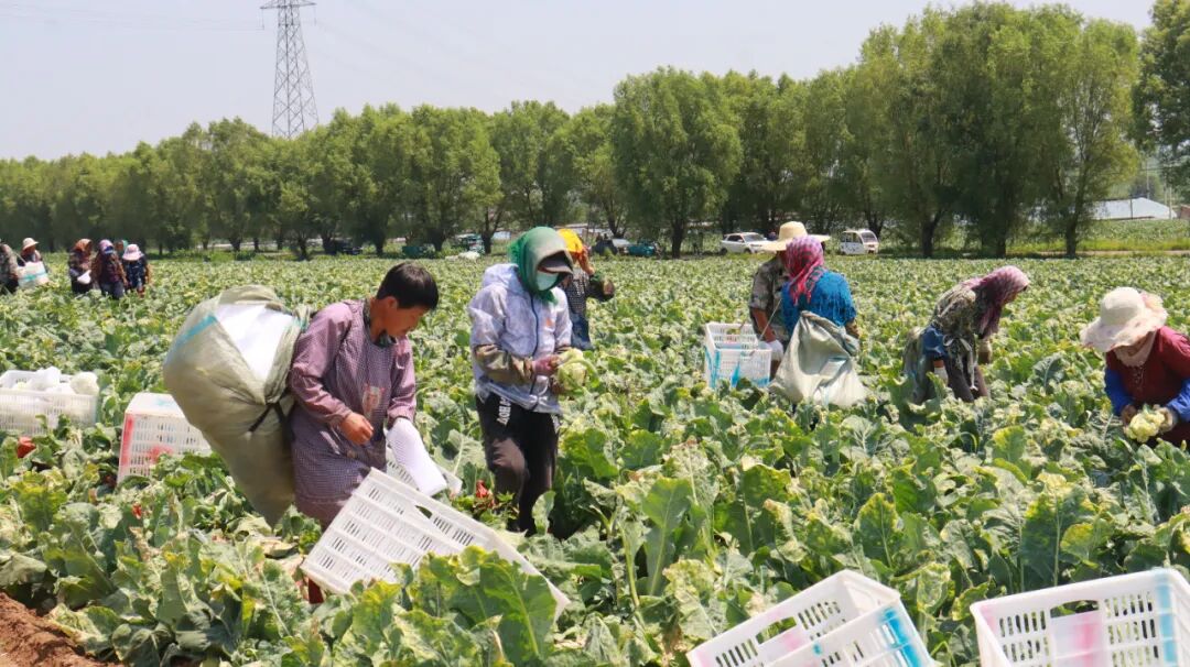 走进聚粮屯镇羊圈子村,记者看到,农民们正操作农机为朝天椒和大葱进行松土作业,确保土壤透气保墒,促进作物根系发育。另一边农户们分散在垄间,他们弯着腰,手里拿着镰刀正忙着采摘一颗颗饱满的菜花,紧实洁白的花球被整齐码放在篮子里,很快堆成小山,编织出一幅活力满溢的农忙画卷。