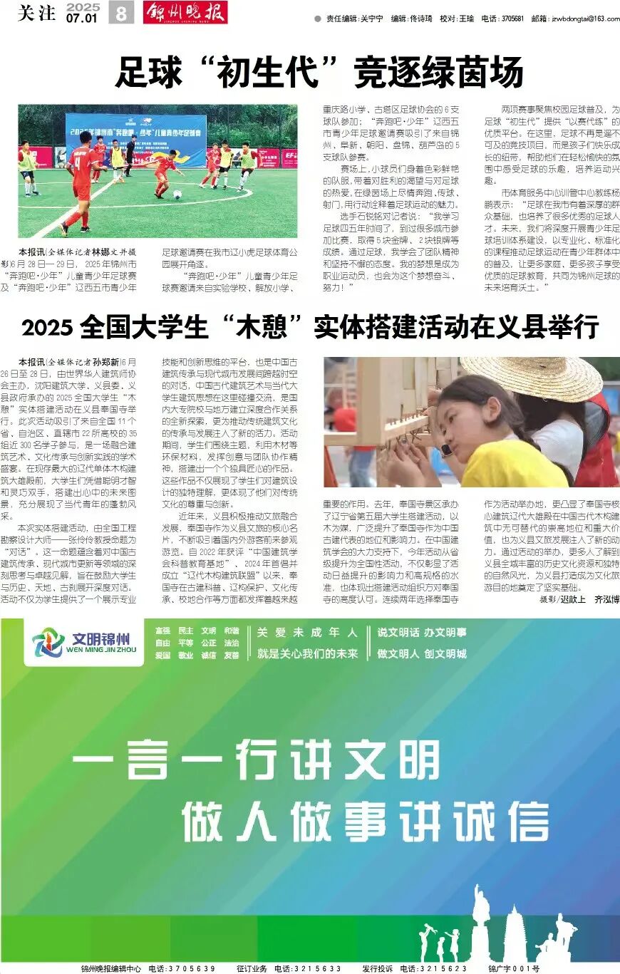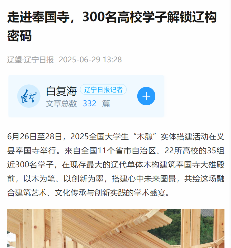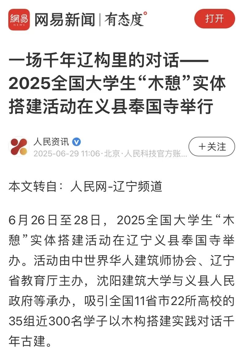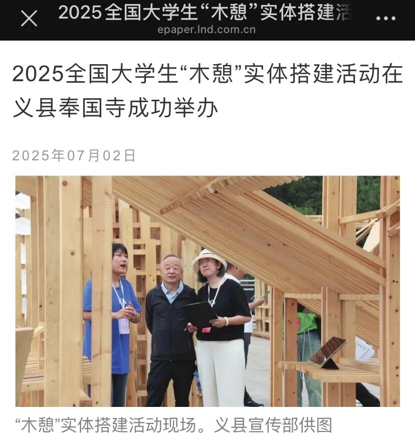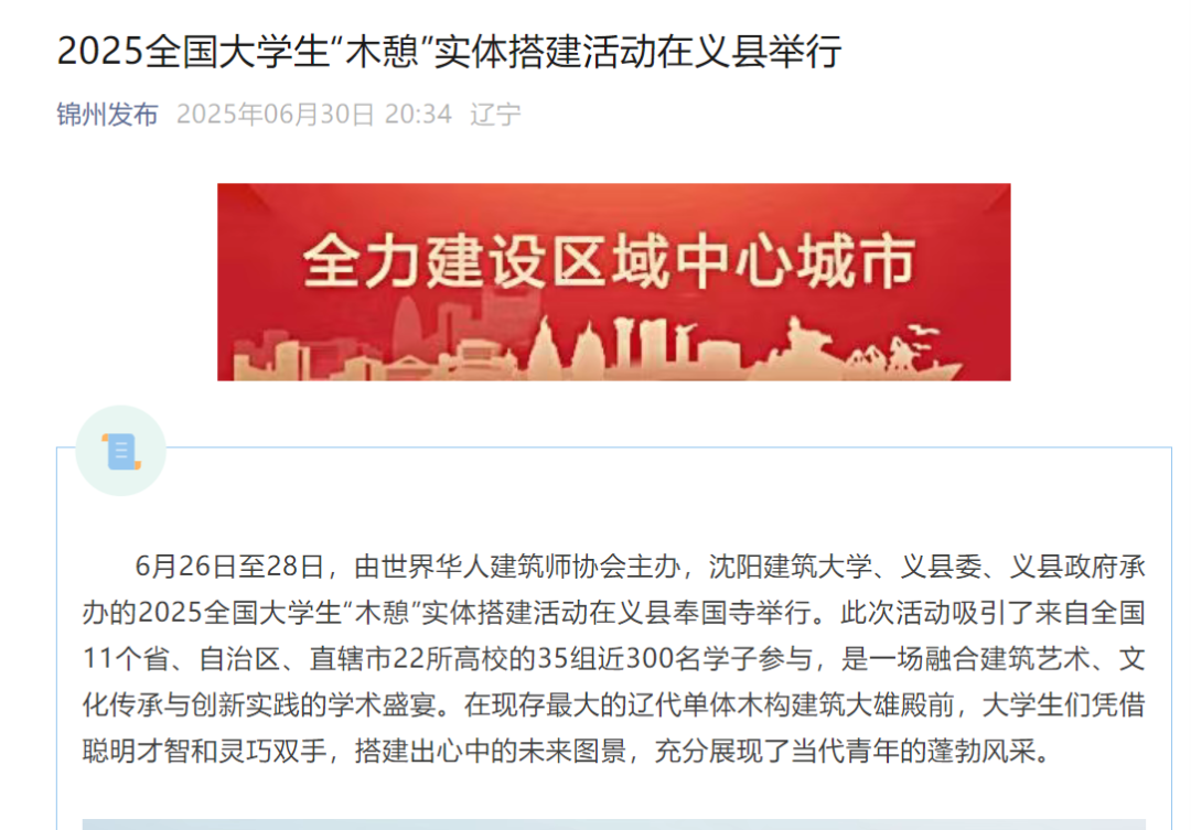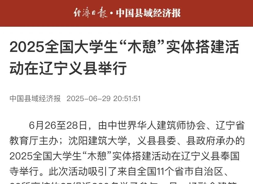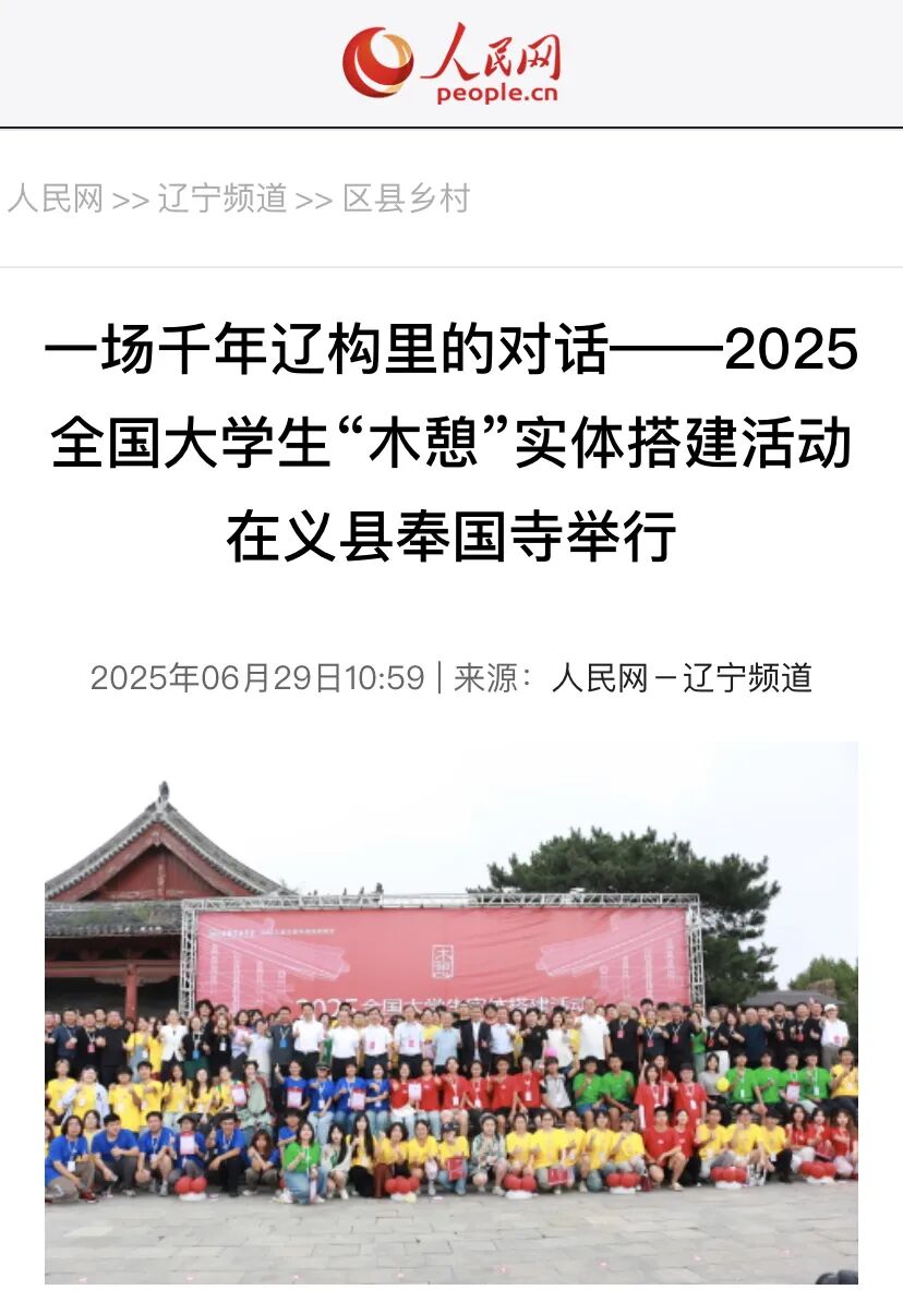 6月26日至28日,2025全国大学生“木憩”实体搭建活动在义县奉国寺举行。此次活动吸引了来自全国22所高校近300名学子参与,充分展现了当代青年的蓬勃风采。活动的举办引来人民网、中国县域经济报、辽宁日报、锦州晚报、网易新闻等多家官方主流媒体纷纷报道,引发热烈反响。