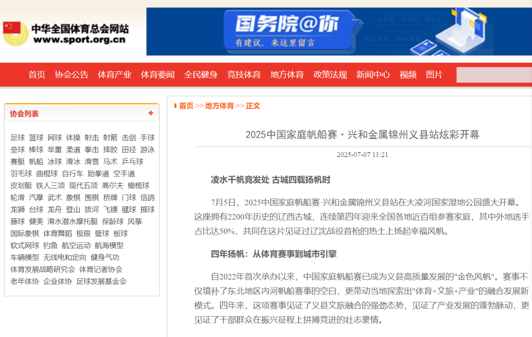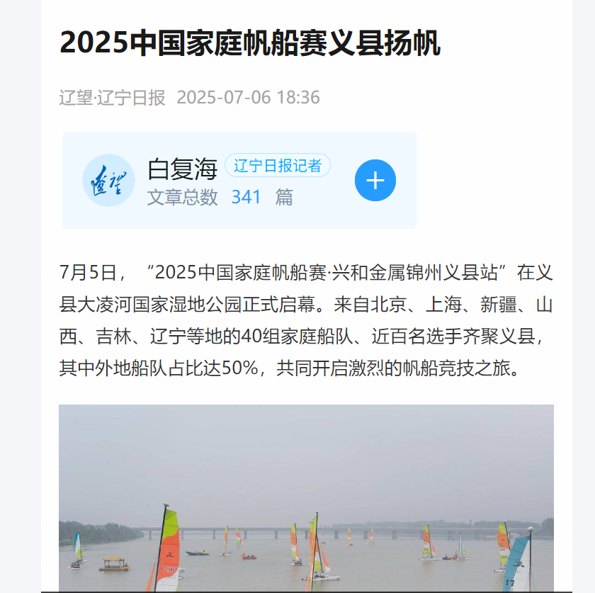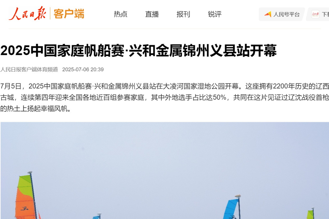 7月5日,2025中国家庭帆船赛·兴和金属锦州义县站在义县大凌河国家湿地公园举行。来自全国各地近百名帆船爱好者齐聚一堂,共同见证这场水上盛宴。赛事旨在推广帆船运动,进一步促进义县的文化、旅游和体育产业发展。这一赛事活动吸引了人民日报客户端、中国日报网、中华全国体育总会网、辽宁日报等多家官方主流媒体宣传报道,引发热烈反响。