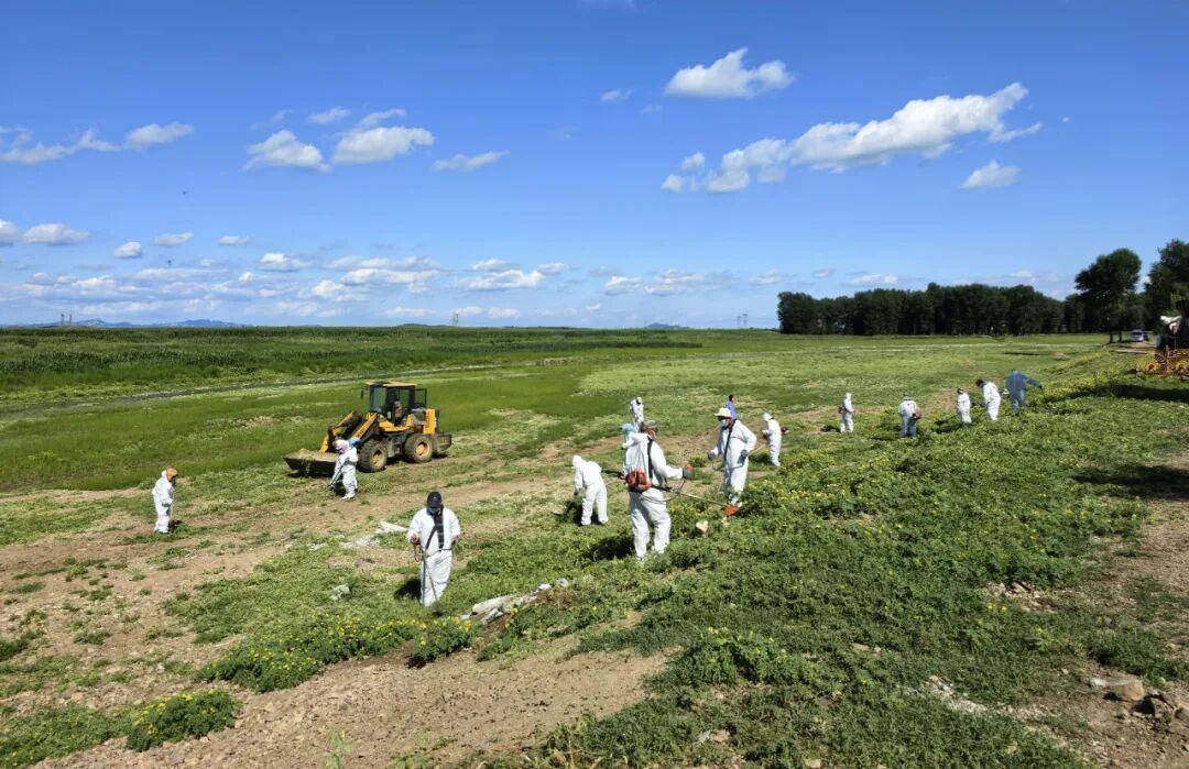 面对严峻形势,义县农业农村局科学研判,精准施策,组建专业队伍,针对刺萼龙葵的特性,采取分区分级、科学高效的治理策略:一是物理防控,工作人员身着防护服,使用专业工具逐株拔除,对已结籽植株采取“剪花序+装袋灭活”处理,防止种子飘落;二是无害化处置,所有铲除植株均进行深埋,彻底切断二次传播途径;三是科技赋能,结合卫星遥感与无人机监测,精准定位零星扩散点,确保“发现一株、清除一株”,不留死角。