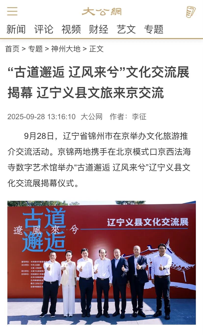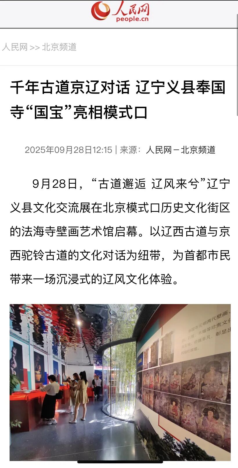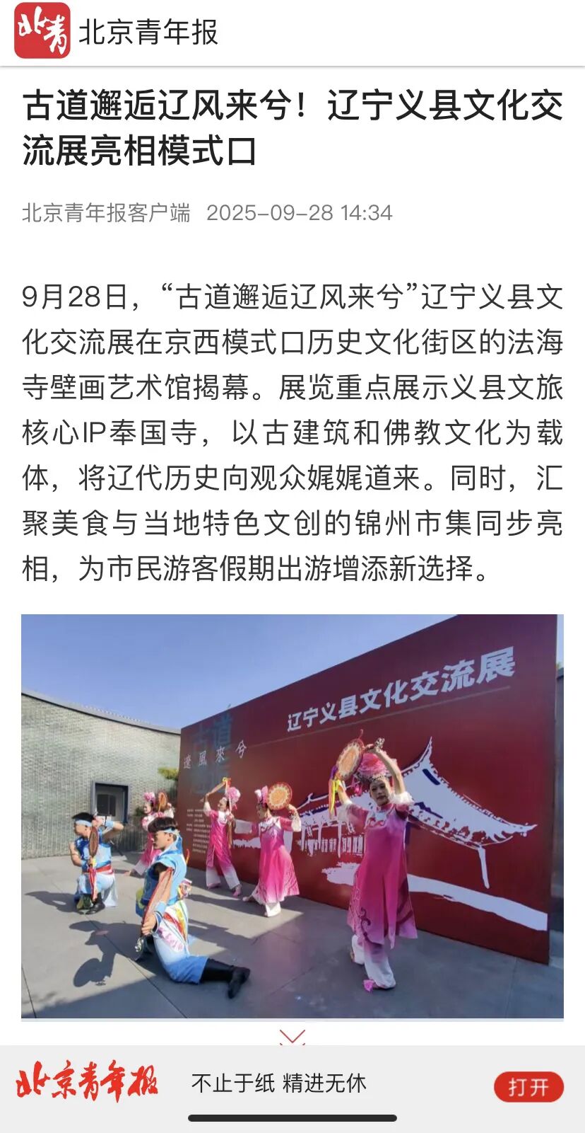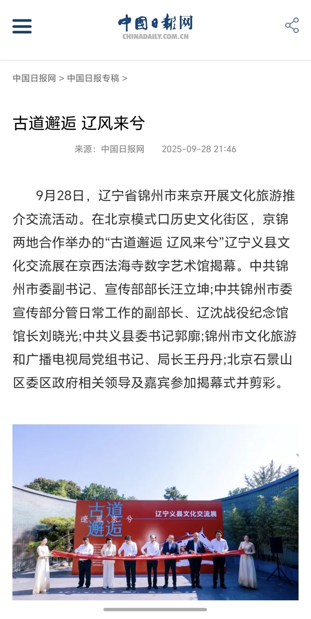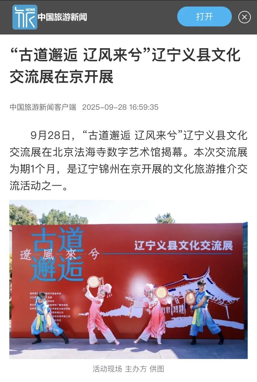 9月28日,在北京模式口历史文化街区,京锦两地合作举办的“古道邂逅 辽风来兮”辽宁义县文化交流展在京西法海寺数字艺术馆揭幕。交流展为期一个月,分为辽西古道宝藏小城、英雄城市大义之州、关东巨刹千年辽风、营造中国古建之魂、古城千载慕名而来、何以为辽美美与共等单元,以大量精美的展示和图文介绍将小城义县的历史文化禀赋表达得淋漓尽致,同时,“辽风文创”和“辽潮旅拍”更着眼于与游客更多地体验互动。展出期间,北京市民和外地游客可在模式口驼铃古道一睹宝藏小城和千年国宝魅力风采。展览活动得到人民网、大公网、中国旅游新闻客户端、北京日报客户端、北京青年报等众多主流媒体关注报道,引起热烈反响。