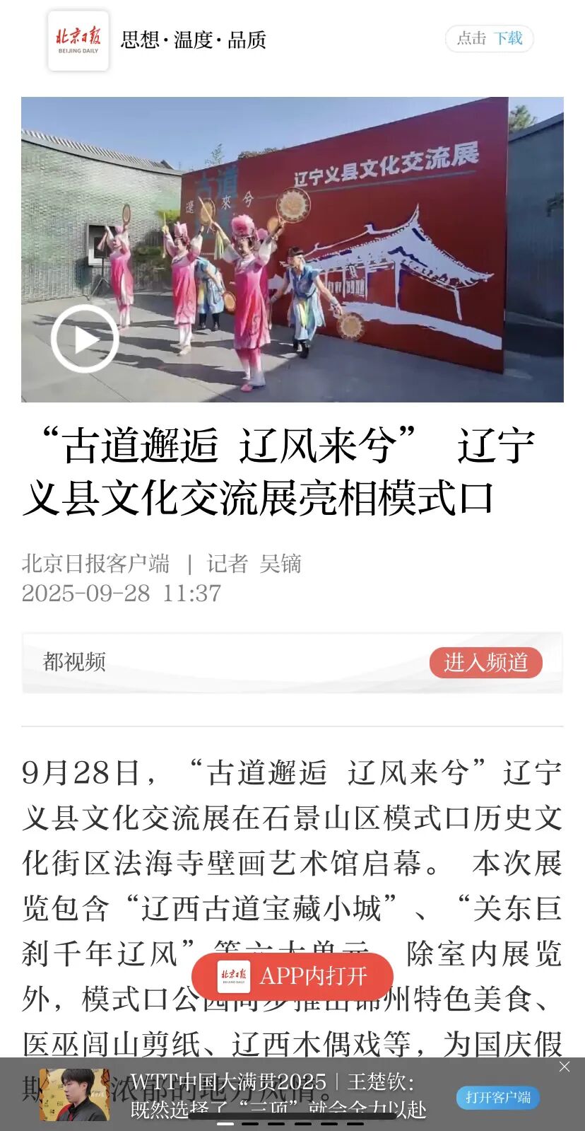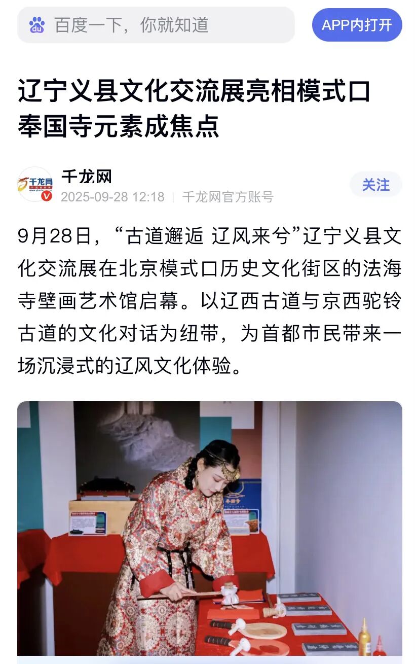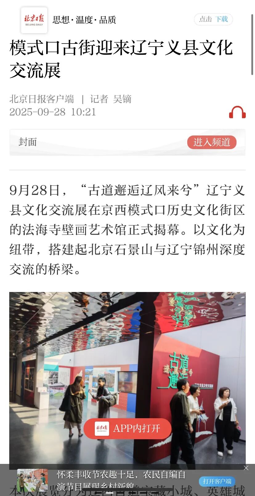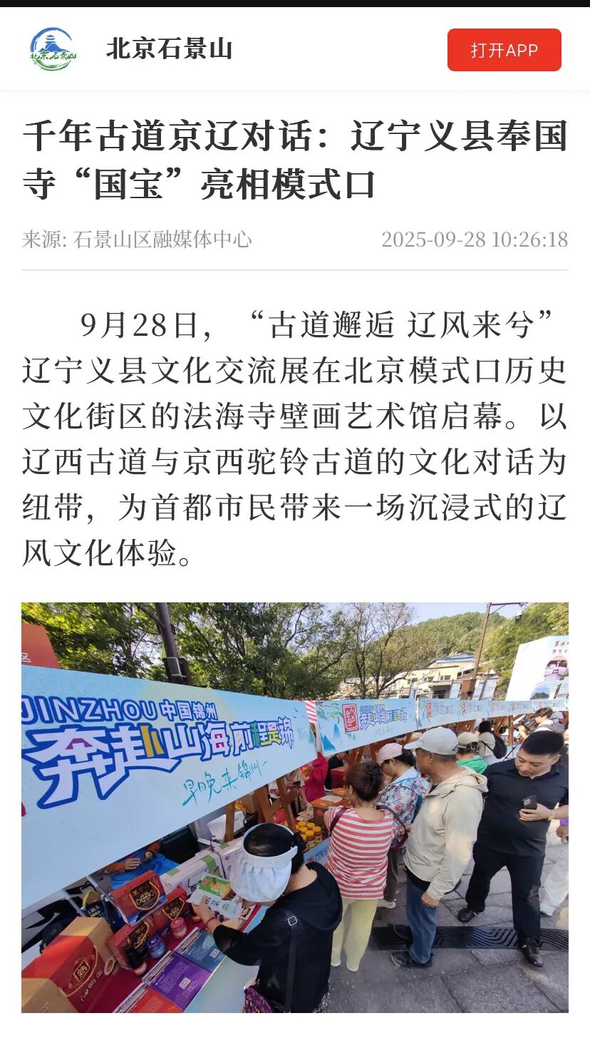 9月28日,在北京模式口历史文化街区,京锦两地合作举办的“古道邂逅 辽风来兮”辽宁义县文化交流展在京西法海寺数字艺术馆揭幕。交流展为期一个月,分为辽西古道宝藏小城、英雄城市大义之州、关东巨刹千年辽风、营造中国古建之魂、古城千载慕名而来、何以为辽美美与共等单元,以大量精美的展示和图文介绍将小城义县的历史文化禀赋表达得淋漓尽致,同时,“辽风文创”和“辽潮旅拍”更着眼于与游客更多地体验互动。展出期间,北京市民和外地游客可在模式口驼铃古道一睹宝藏小城和千年国宝魅力风采。展览活动得到人民网、大公网、中国旅游新闻客户端、北京日报客户端、北京青年报等众多主流媒体关注报道,引起热烈反响。