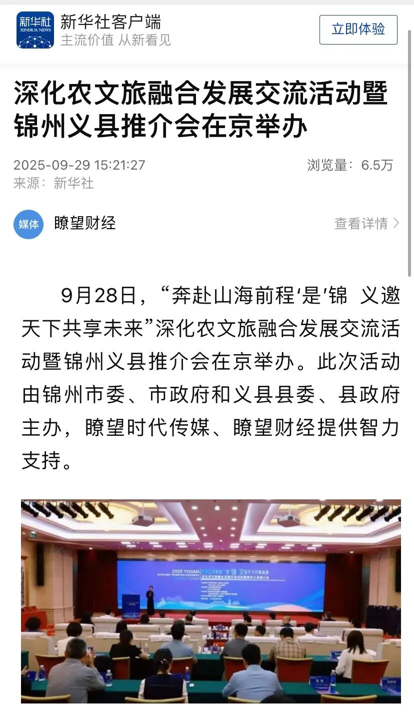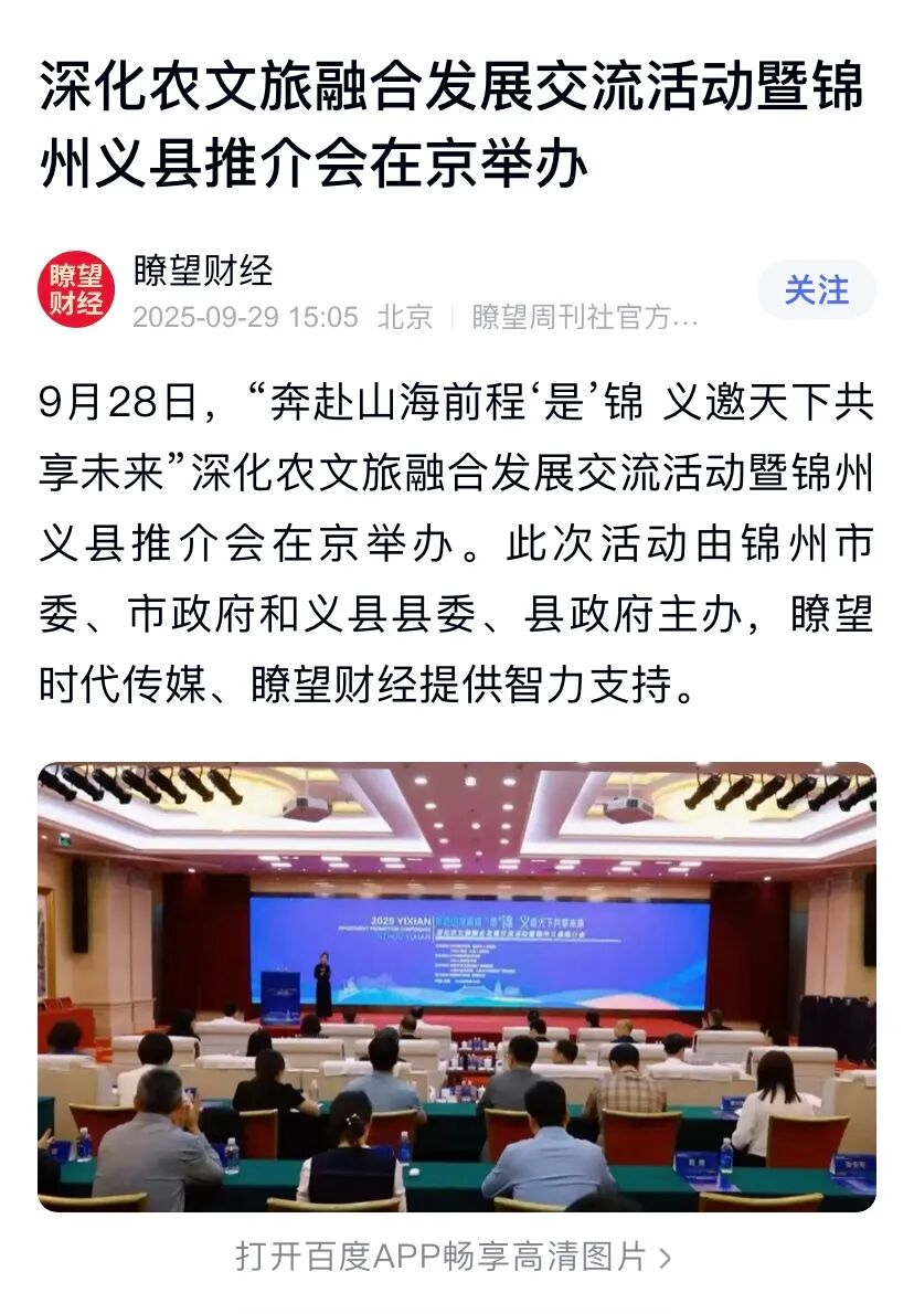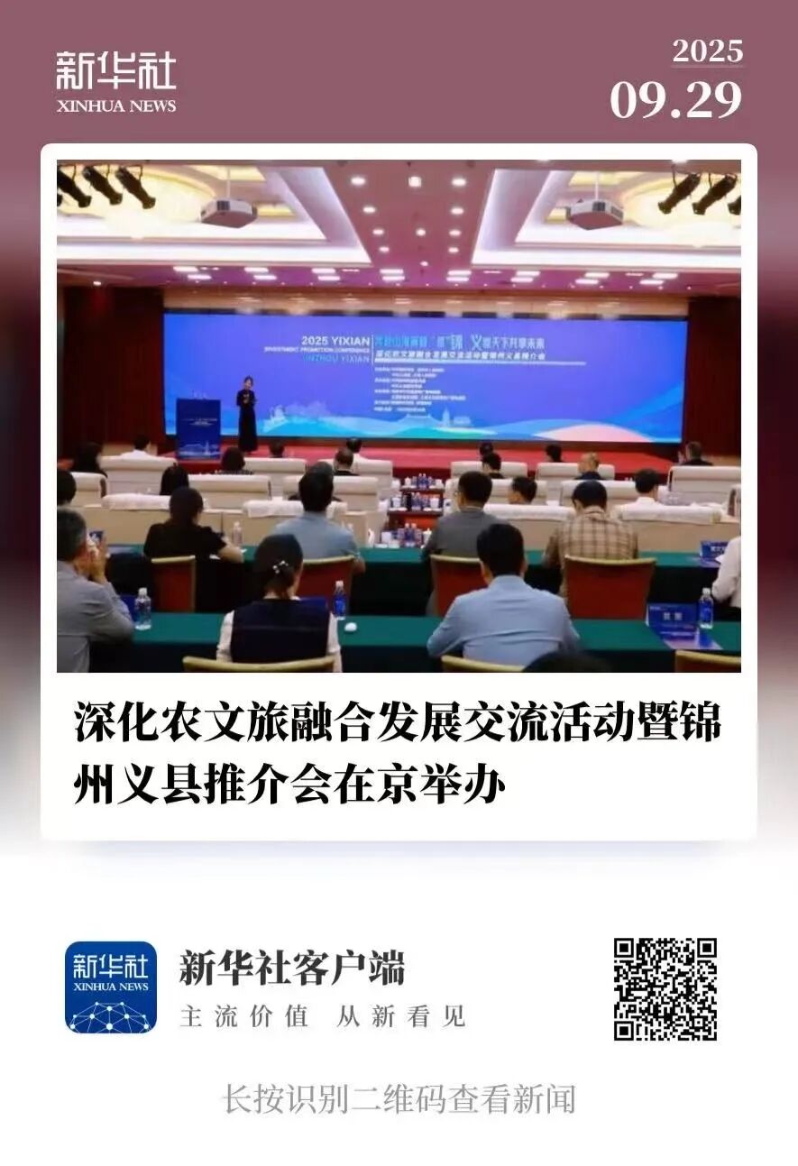 9月28日,“奔赴山海前程‘是’锦 义邀天下共享未来”深化农文旅融合发展交流活动暨锦州义县推介会在京举办。各方人士深入探讨农文旅融合发展的新路径、新模式,全面展示宣介了锦州和义县在农业、文化、旅游等方面的独特优势、宝贵资源与发展潜力。活动得到新华社客户端、瞭望财经、海月新闻等众多主流媒体关注报道,引起热烈反响。