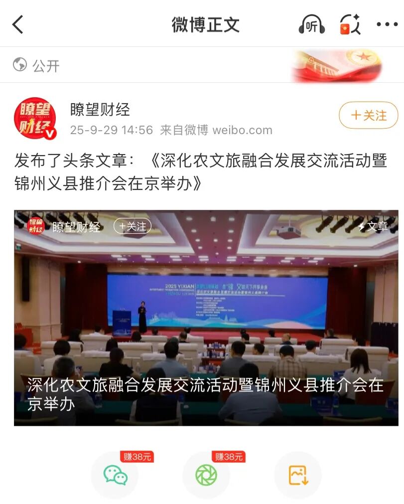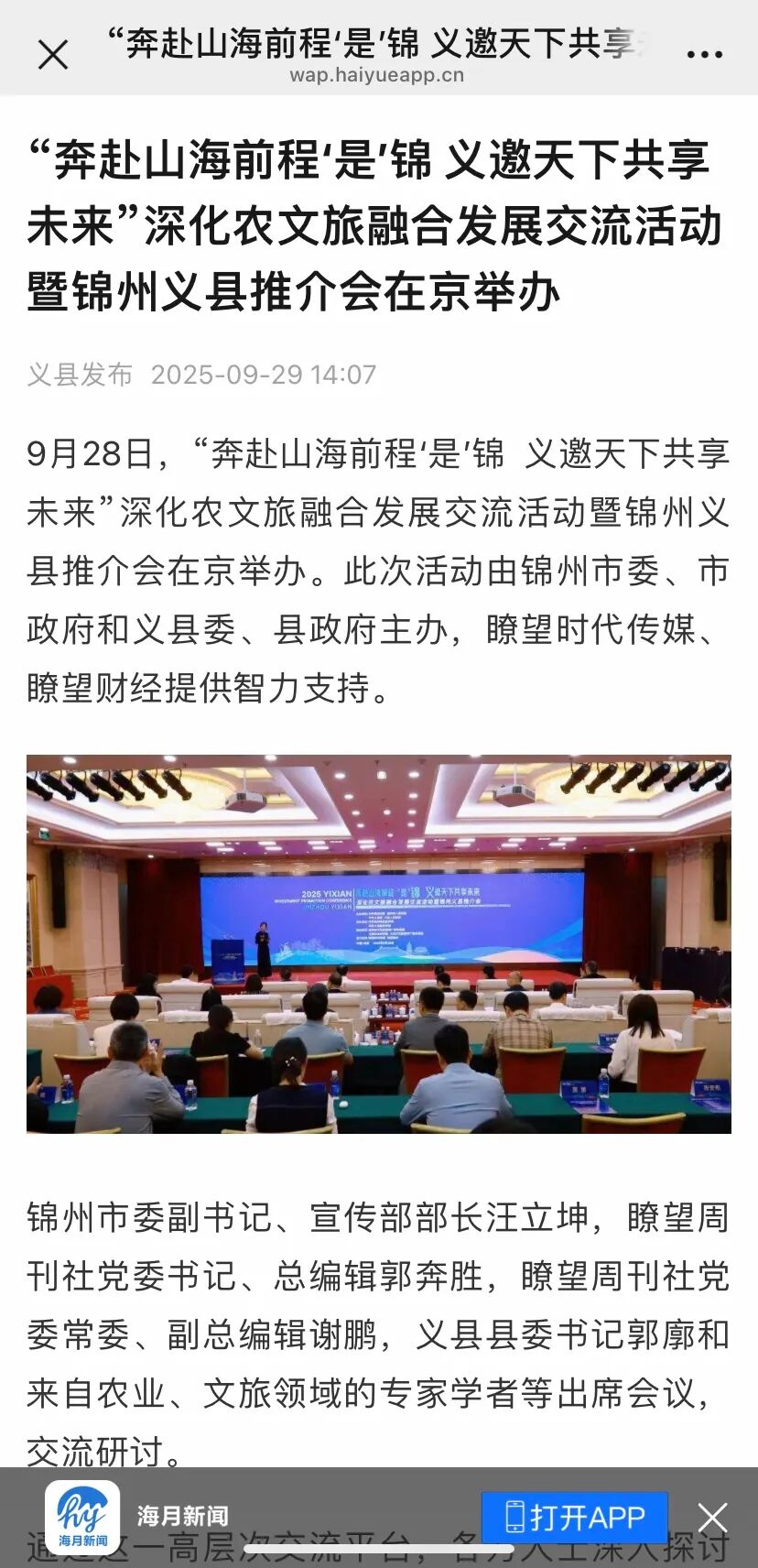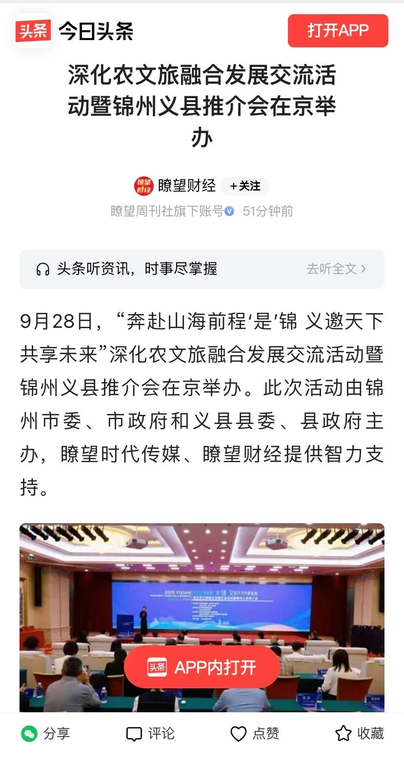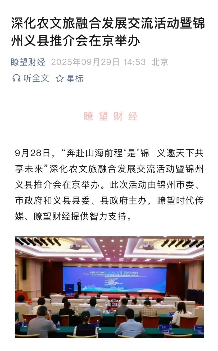 9月28日,“奔赴山海前程‘是’锦 义邀天下共享未来”深化农文旅融合发展交流活动暨锦州义县推介会在京举办。各方人士深入探讨农文旅融合发展的新路径、新模式,全面展示宣介了锦州和义县在农业、文化、旅游等方面的独特优势、宝贵资源与发展潜力。活动得到新华社客户端、瞭望财经、海月新闻等众多主流媒体关注报道,引起热烈反响。