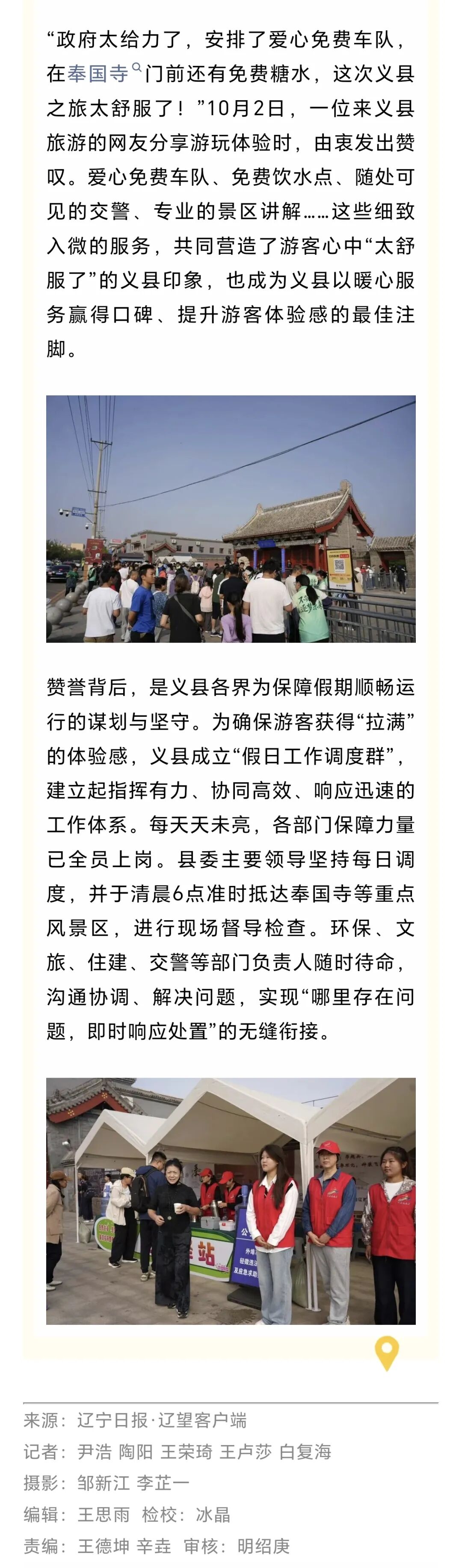 这个“十一”假期,义县文旅产业交出了一份亮眼的成绩单。凭借独具特色的文旅活动、优质的服务保障与火爆的消费市场,其成功实践获得了省级权威媒体《辽宁日报》以及广大游客的点名表扬,为全省县域文旅高质量发展提供了“义县样本”,小编整理了他们的“朋友圈”,看看他们是怎么说的吧。