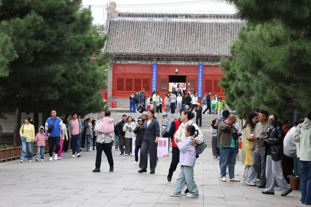 古刹内外,随处可见携老扶幼、举家同游的温馨场景,人们漫步于古建筑之间欣赏秋日美景,领略千年文化。
