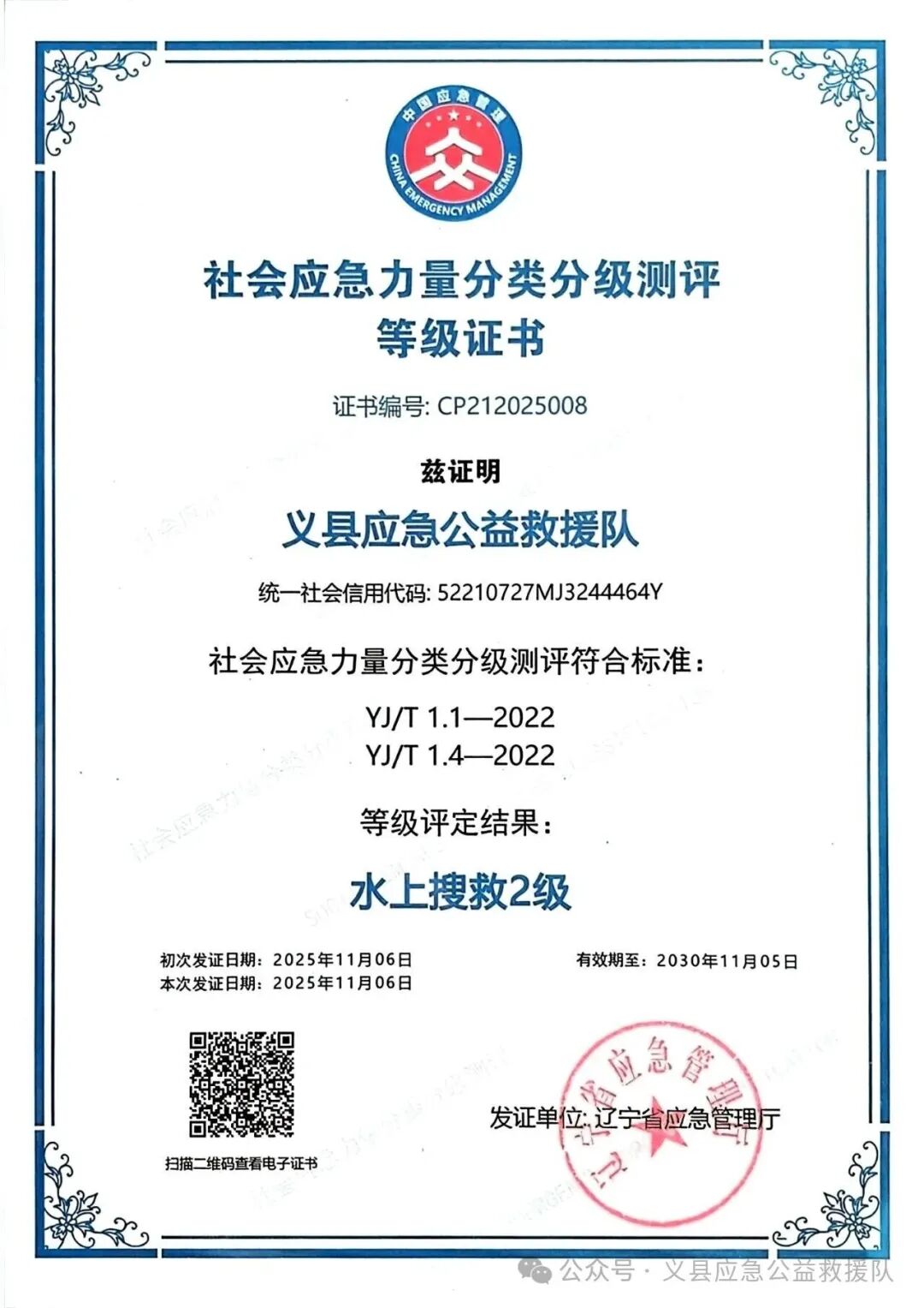 此次测评,义县应急公益救援队成功斩获水上搜救二级专业资质认证,这既是对队伍前期筹备与现场表现的充分肯定,更是专业能力的权威背书。未来,队伍将以此次认证为新起点,持续精进救援技能、完善保障体系,始终坚守“一切以人民利益为根本”的初心,在各类应急救援任务中勇挑重担,全力守护群众生命财产安全。
