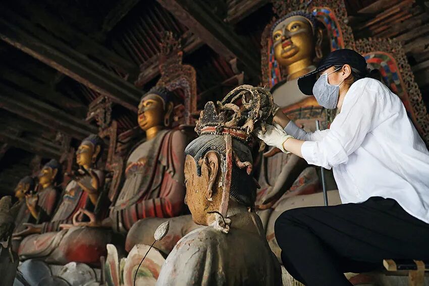 工作人员对奉国寺的彩绘泥塑进行保护修复 姚剑锋摄/本刊