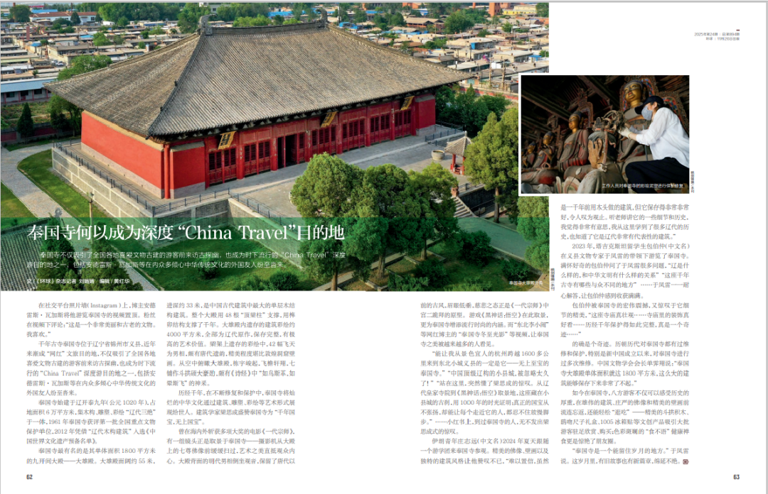 近日,新华社《坏球》杂志以“奉国寺何以成为深度‘ChinaTravel’目的地”为题,发文介绍千年古寺奉国寺近年来渐成“网红”文旅目的地,不仅吸引了全国各地喜爱文物古建的游客前来访古探幽,也成为时下流行的“China Travel”深度游目的地之一,众多倾心中华传统文化的外国友人纷至沓来。
