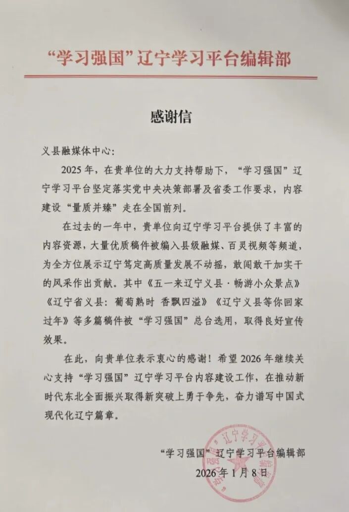 近日,义县融媒体中心收到来自“学习强国”辽宁学习平台编辑部的感谢信,对一年来高度重视平台供稿工作、持续输送优质内容表示高度肯定和诚挚感谢。