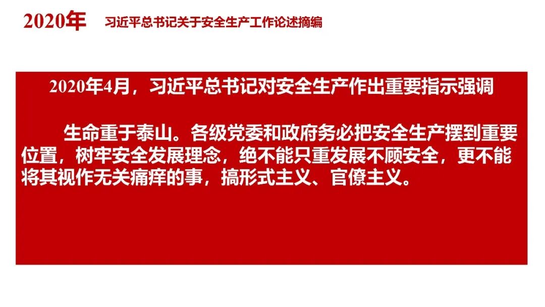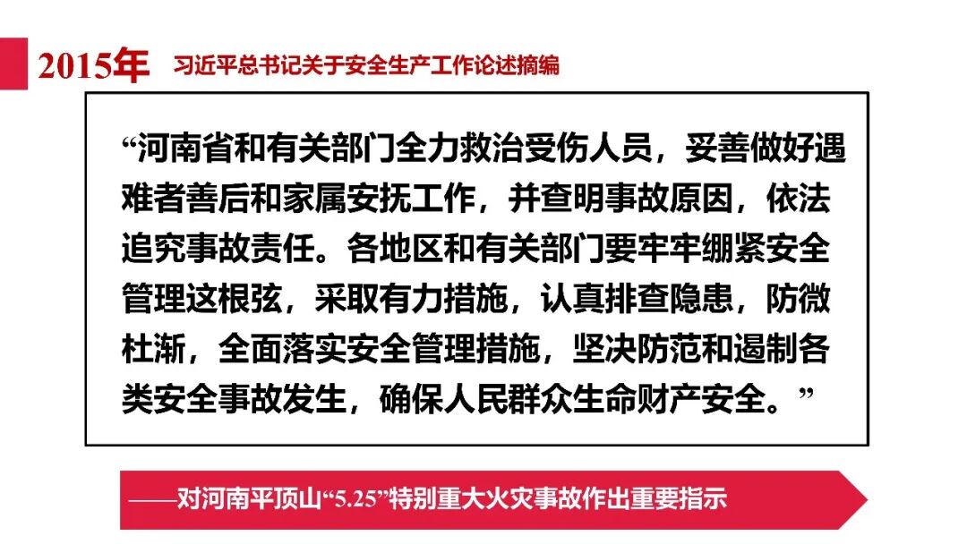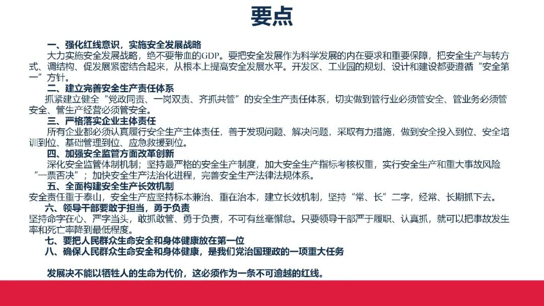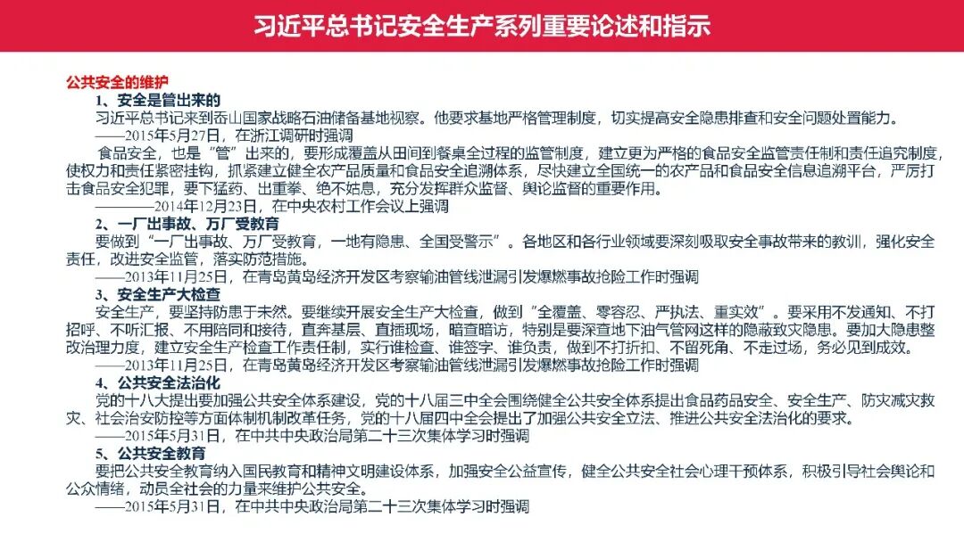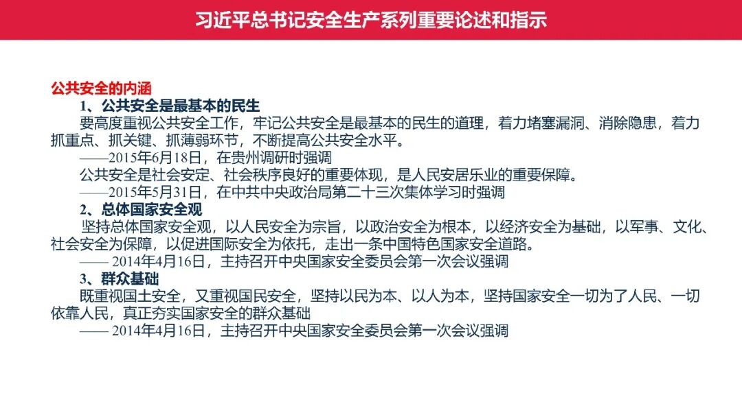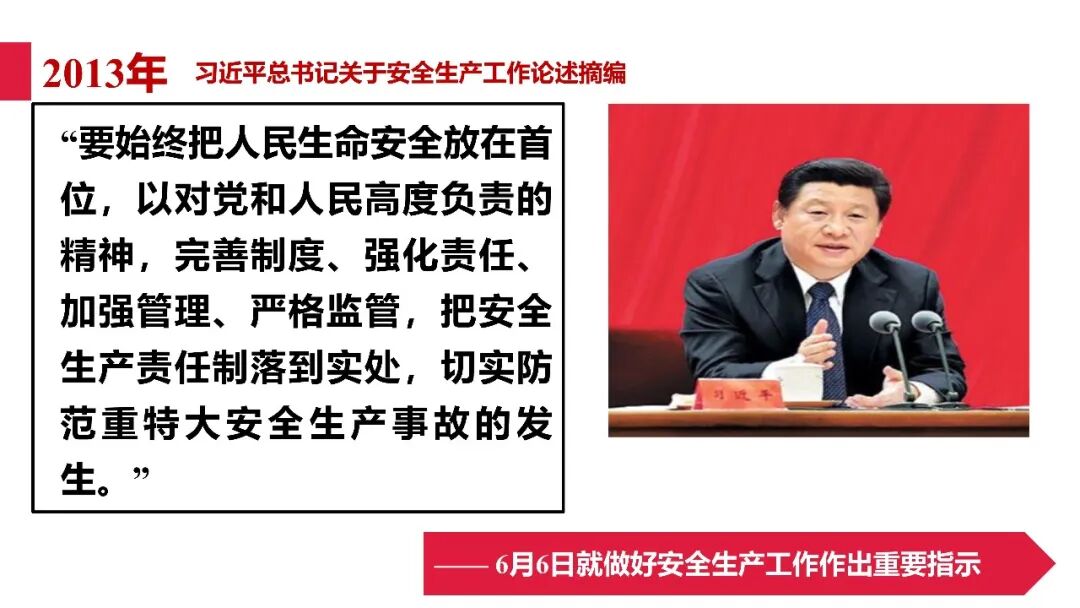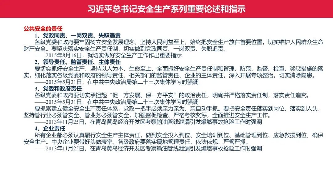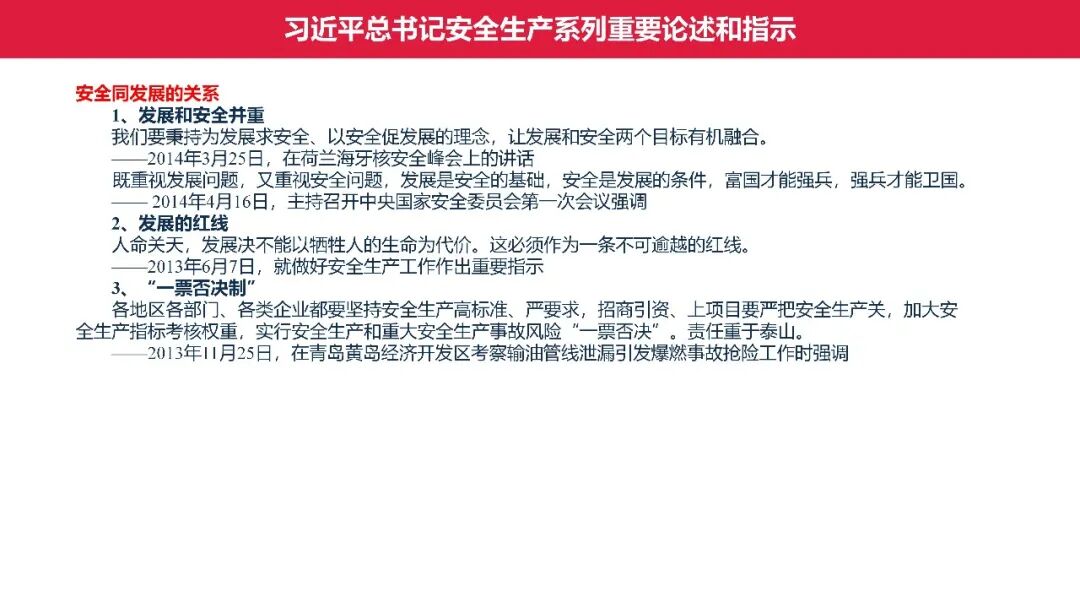 牢固树立安全发展理念和红线意识:习近平总书记强调 “人命关天,发展决不能以牺牲人的生命为代价。这必须作为一条不可逾越的红线”。要始终把人民群众生命安全放在第一位,任何时候、任何情况下都不能突破这条红线,同时要统筹好发展和安全,不能以牺牲安全为代价换取发展。建立健全安全生产责任体系:党政同责:安全生产工作,党委和政府都要抓,党政一把手必须亲力亲为、亲自动手抓。明确党政领导班子成员一岗双责、齐抓共管,把责任落实到每一个领导工作岗位上。三管三必须:坚持管行业必须管安全、管业务必须管安全、管生产经营必须管安全,形成完整的安全生产领导责任和监管责任体系。企业主体责任:所有企业都必须认真履行安全生产主体责任,做到安全投入到位、安全培训到位、基础管理到位、应急救援到位,确保安全生产,中央企业要带好头做表率。建立科学的安全生产监管机制和方法:以防范和遏制重特大事故为重点:各级安全监管监察部门要牢固树立红线意识,坚持标本兼治、综合治理、系统建设,统筹推进安全生产领域改革发展。提高安全监管执法实效:做到 “全覆盖、零容忍、严执法、重实效”,采用 “四不两直” 方式,即不发通知、不打招呼、不听汇报、不用陪同和接待,直奔基层、直插现场。加大安全生产指标考核权重:各地区各部门、各类企业都要坚持安全生产高标准、严要求,招商引资、上项目要严把安全生产关,实行安全生产和重大安全生产事故风险 “一票否决”。建立长效机制:针对抓安全生产时紧时松问题,要建立长效机制,坚持常、长二字,经常、长期抓下去,特别是要抓薄弱环节,抓那些还不够重视的领域和行业。 打破安全事故 “不可避免论”:习近平总书记的论述打破了 “事故阶段论” 和 “可以原谅论”,使我们深刻认识到,抓好安全生产工作的信心决心不能动摇,保障人民生命安全必须更加积极主动作为,不能走西方工业化国家的老路。