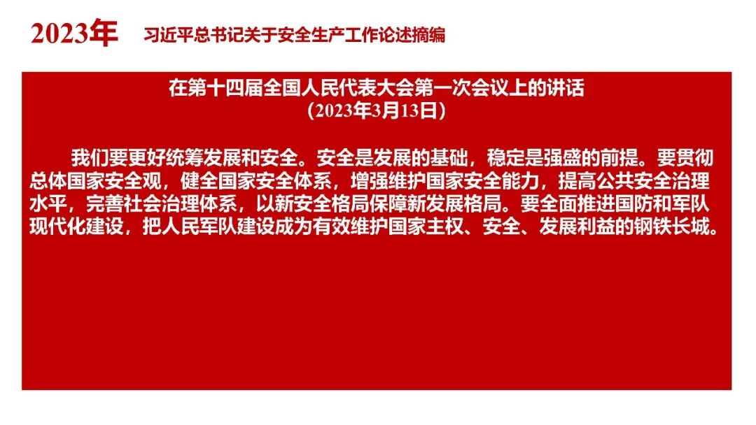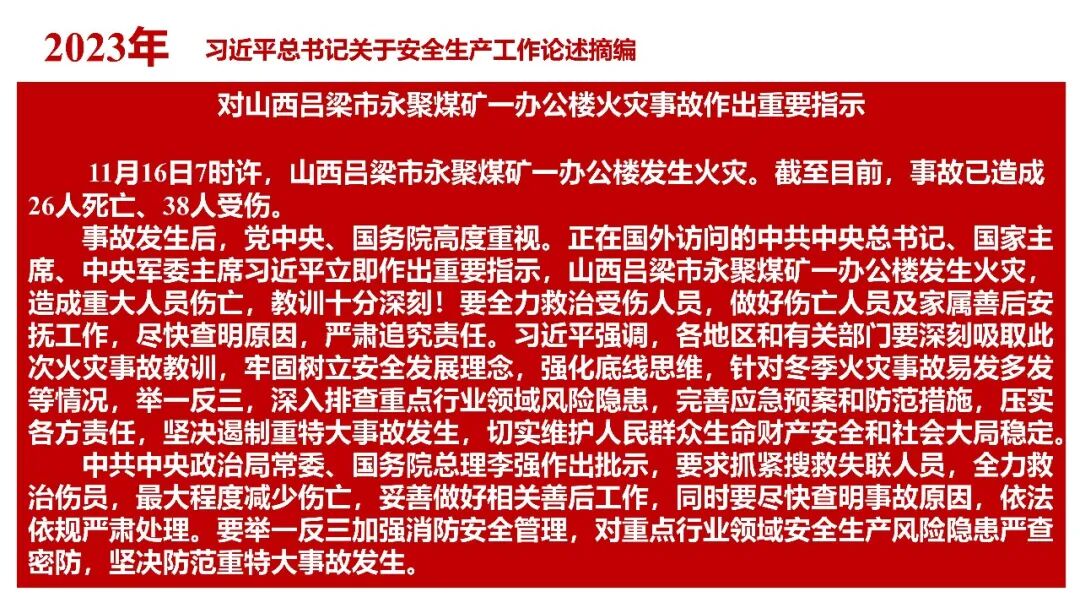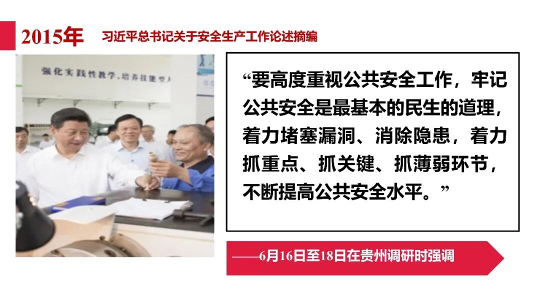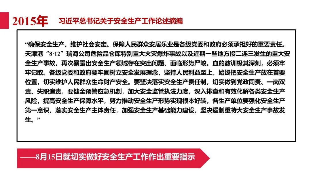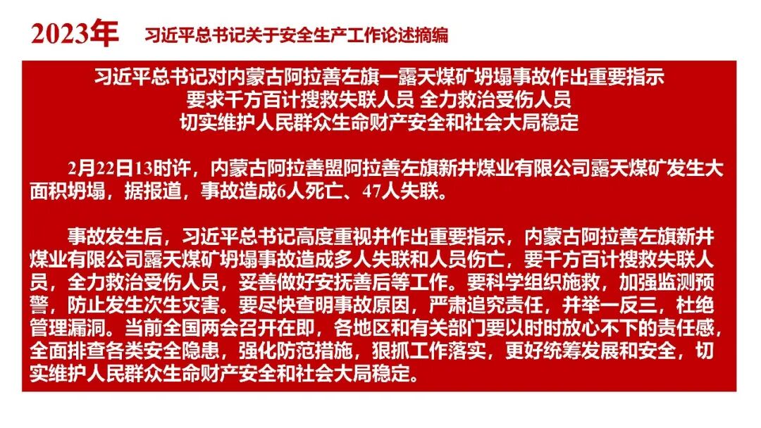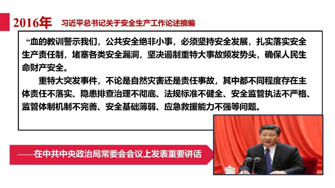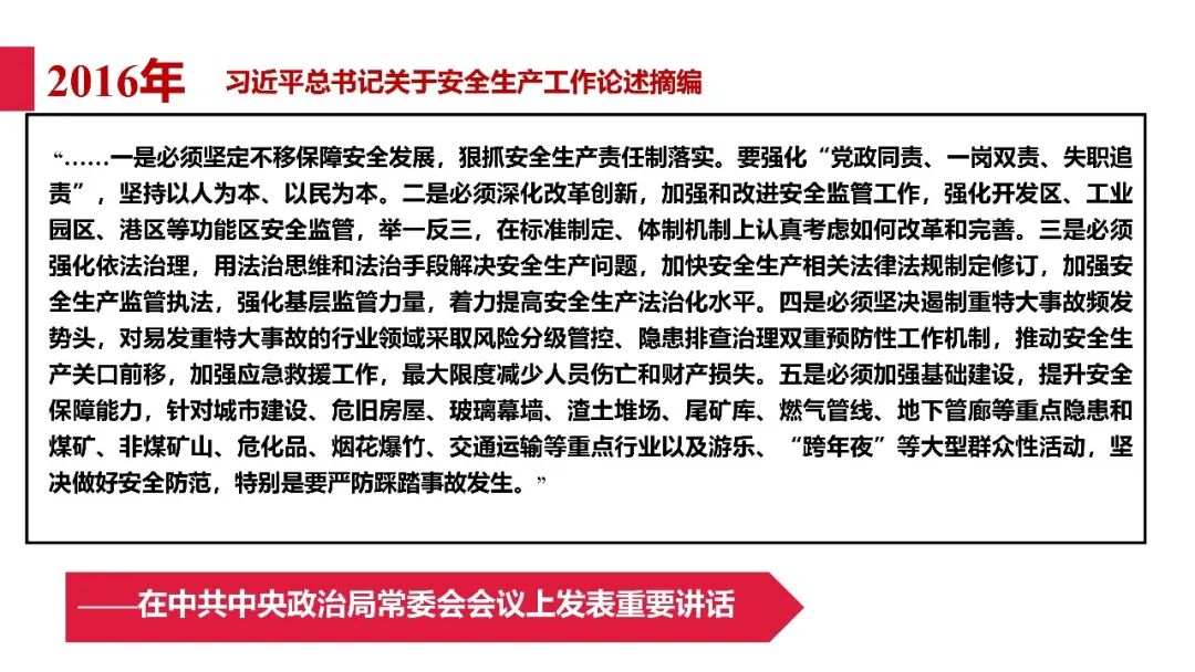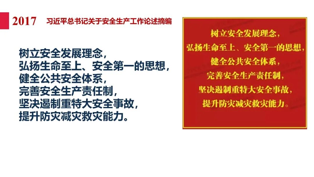 牢固树立安全发展理念和红线意识:习近平总书记强调 “人命关天,发展决不能以牺牲人的生命为代价。这必须作为一条不可逾越的红线”。要始终把人民群众生命安全放在第一位,任何时候、任何情况下都不能突破这条红线,同时要统筹好发展和安全,不能以牺牲安全为代价换取发展。建立健全安全生产责任体系:党政同责:安全生产工作,党委和政府都要抓,党政一把手必须亲力亲为、亲自动手抓。明确党政领导班子成员一岗双责、齐抓共管,把责任落实到每一个领导工作岗位上。三管三必须:坚持管行业必须管安全、管业务必须管安全、管生产经营必须管安全,形成完整的安全生产领导责任和监管责任体系。企业主体责任:所有企业都必须认真履行安全生产主体责任,做到安全投入到位、安全培训到位、基础管理到位、应急救援到位,确保安全生产,中央企业要带好头做表率。建立科学的安全生产监管机制和方法:以防范和遏制重特大事故为重点:各级安全监管监察部门要牢固树立红线意识,坚持标本兼治、综合治理、系统建设,统筹推进安全生产领域改革发展。提高安全监管执法实效:做到 “全覆盖、零容忍、严执法、重实效”,采用 “四不两直” 方式,即不发通知、不打招呼、不听汇报、不用陪同和接待,直奔基层、直插现场。加大安全生产指标考核权重:各地区各部门、各类企业都要坚持安全生产高标准、严要求,招商引资、上项目要严把安全生产关,实行安全生产和重大安全生产事故风险 “一票否决”。建立长效机制:针对抓安全生产时紧时松问题,要建立长效机制,坚持常、长二字,经常、长期抓下去,特别是要抓薄弱环节,抓那些还不够重视的领域和行业。 打破安全事故 “不可避免论”:习近平总书记的论述打破了 “事故阶段论” 和 “可以原谅论”,使我们深刻认识到,抓好安全生产工作的信心决心不能动摇,保障人民生命安全必须更加积极主动作为,不能走西方工业化国家的老路。