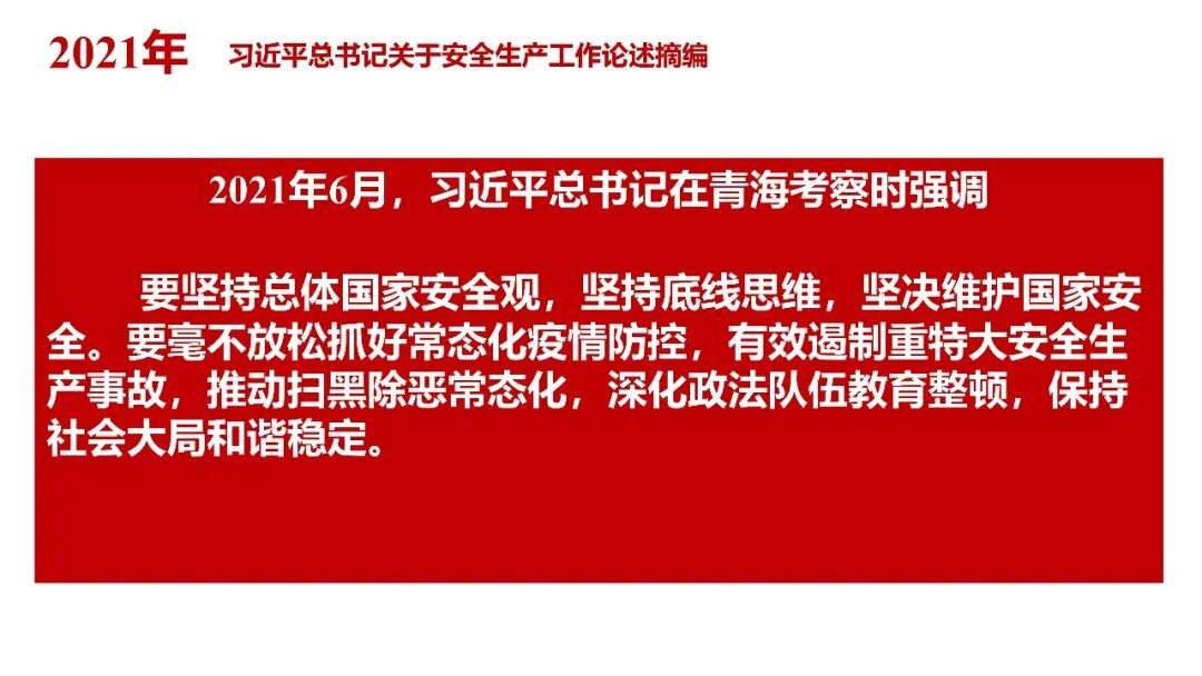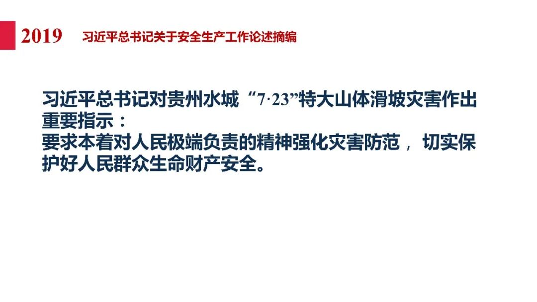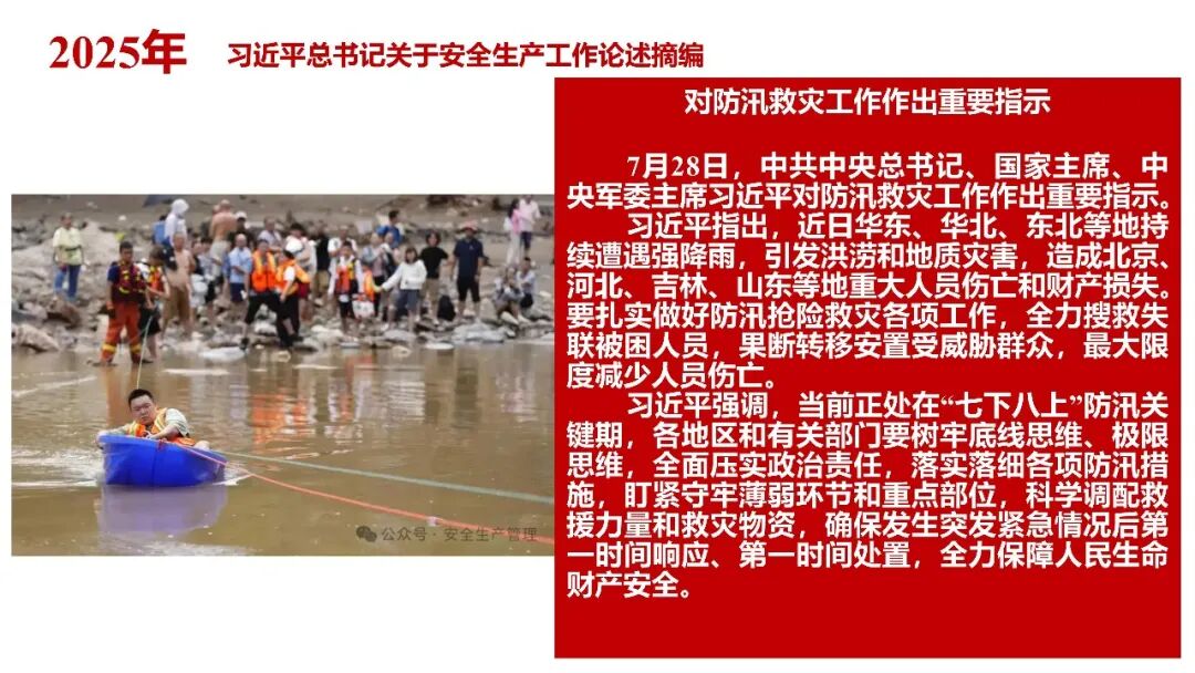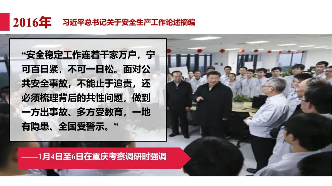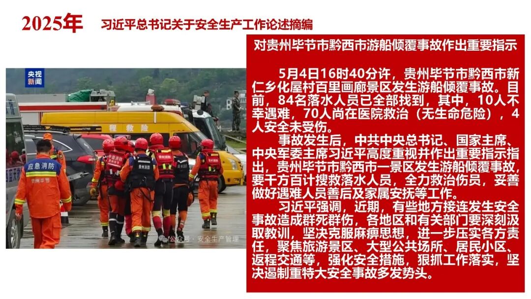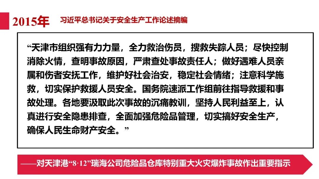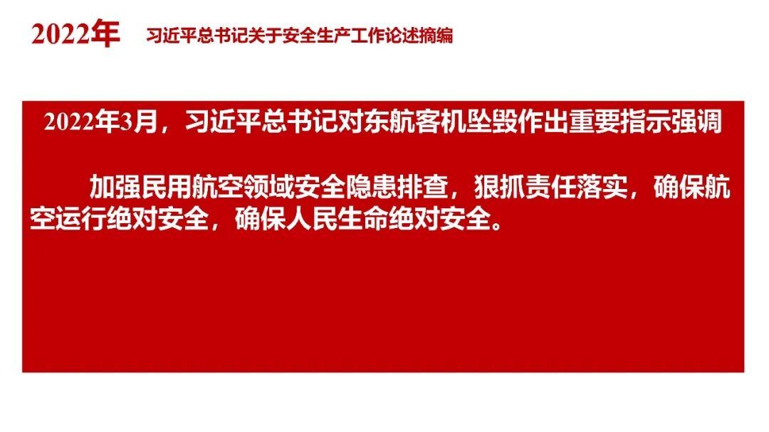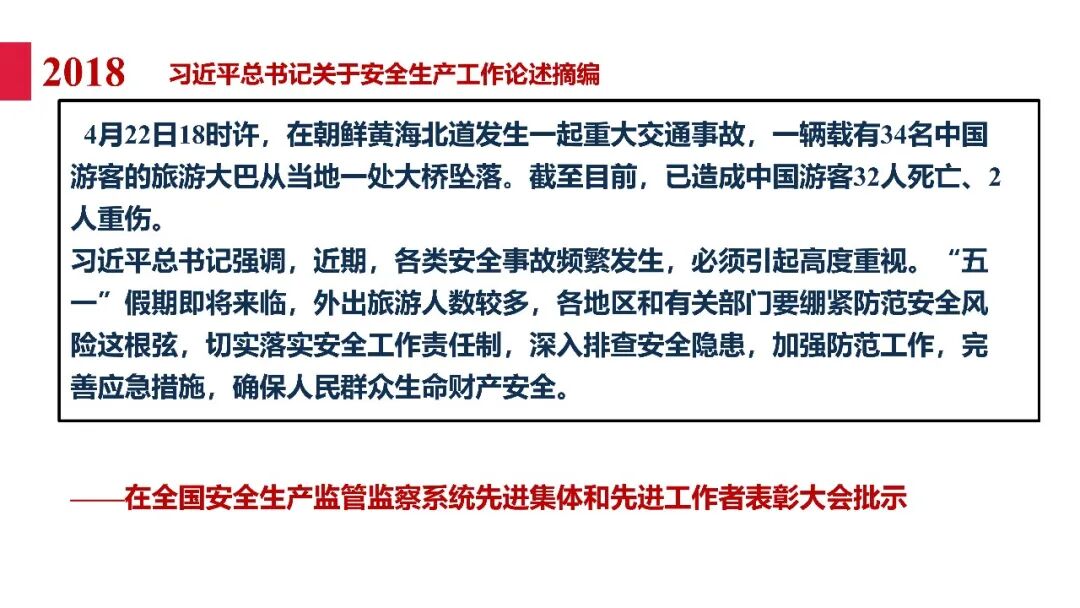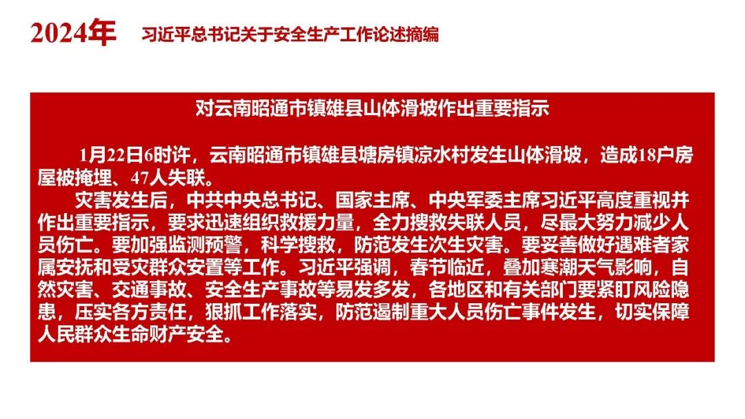 牢固树立安全发展理念和红线意识:习近平总书记强调 “人命关天,发展决不能以牺牲人的生命为代价。这必须作为一条不可逾越的红线”。要始终把人民群众生命安全放在第一位,任何时候、任何情况下都不能突破这条红线,同时要统筹好发展和安全,不能以牺牲安全为代价换取发展。建立健全安全生产责任体系:党政同责:安全生产工作,党委和政府都要抓,党政一把手必须亲力亲为、亲自动手抓。明确党政领导班子成员一岗双责、齐抓共管,把责任落实到每一个领导工作岗位上。三管三必须:坚持管行业必须管安全、管业务必须管安全、管生产经营必须管安全,形成完整的安全生产领导责任和监管责任体系。企业主体责任:所有企业都必须认真履行安全生产主体责任,做到安全投入到位、安全培训到位、基础管理到位、应急救援到位,确保安全生产,中央企业要带好头做表率。建立科学的安全生产监管机制和方法:以防范和遏制重特大事故为重点:各级安全监管监察部门要牢固树立红线意识,坚持标本兼治、综合治理、系统建设,统筹推进安全生产领域改革发展。提高安全监管执法实效:做到 “全覆盖、零容忍、严执法、重实效”,采用 “四不两直” 方式,即不发通知、不打招呼、不听汇报、不用陪同和接待,直奔基层、直插现场。加大安全生产指标考核权重:各地区各部门、各类企业都要坚持安全生产高标准、严要求,招商引资、上项目要严把安全生产关,实行安全生产和重大安全生产事故风险 “一票否决”。建立长效机制:针对抓安全生产时紧时松问题,要建立长效机制,坚持常、长二字,经常、长期抓下去,特别是要抓薄弱环节,抓那些还不够重视的领域和行业。 打破安全事故 “不可避免论”:习近平总书记的论述打破了 “事故阶段论” 和 “可以原谅论”,使我们深刻认识到,抓好安全生产工作的信心决心不能动摇,保障人民生命安全必须更加积极主动作为,不能走西方工业化国家的老路。