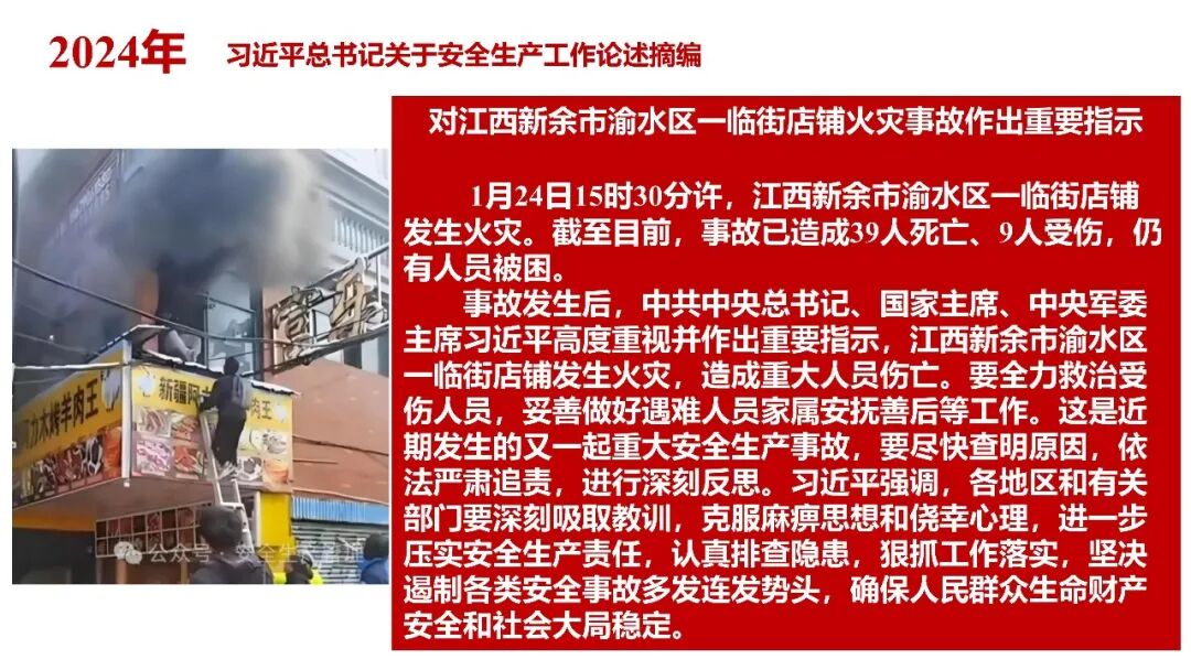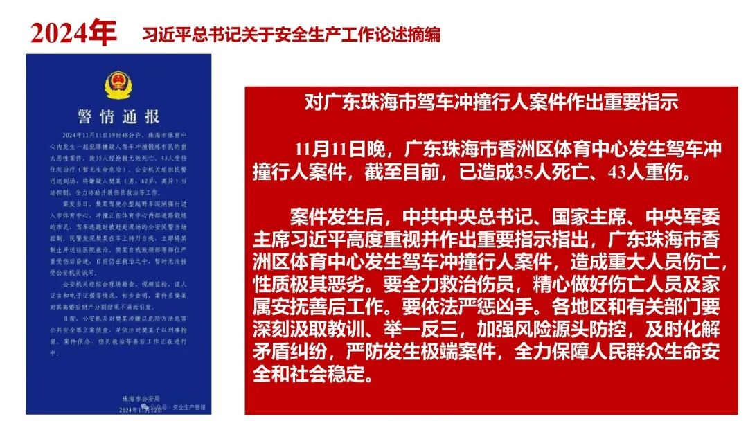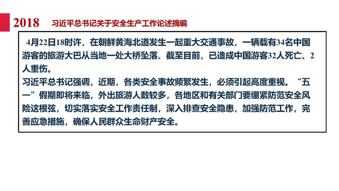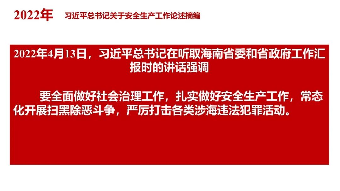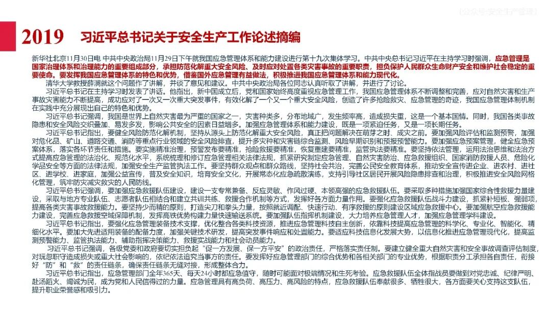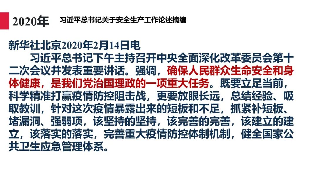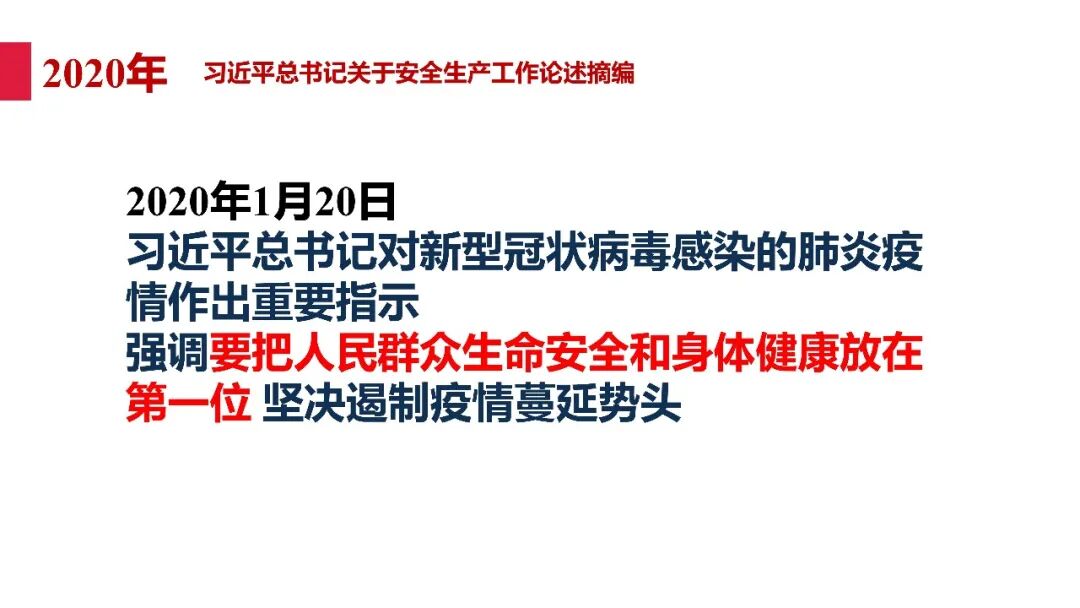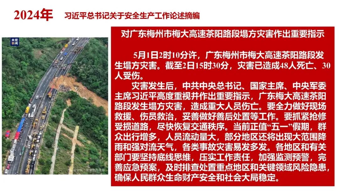 牢固树立安全发展理念和红线意识:习近平总书记强调 “人命关天,发展决不能以牺牲人的生命为代价。这必须作为一条不可逾越的红线”。要始终把人民群众生命安全放在第一位,任何时候、任何情况下都不能突破这条红线,同时要统筹好发展和安全,不能以牺牲安全为代价换取发展。建立健全安全生产责任体系:党政同责:安全生产工作,党委和政府都要抓,党政一把手必须亲力亲为、亲自动手抓。明确党政领导班子成员一岗双责、齐抓共管,把责任落实到每一个领导工作岗位上。三管三必须:坚持管行业必须管安全、管业务必须管安全、管生产经营必须管安全,形成完整的安全生产领导责任和监管责任体系。企业主体责任:所有企业都必须认真履行安全生产主体责任,做到安全投入到位、安全培训到位、基础管理到位、应急救援到位,确保安全生产,中央企业要带好头做表率。建立科学的安全生产监管机制和方法:以防范和遏制重特大事故为重点:各级安全监管监察部门要牢固树立红线意识,坚持标本兼治、综合治理、系统建设,统筹推进安全生产领域改革发展。提高安全监管执法实效:做到 “全覆盖、零容忍、严执法、重实效”,采用 “四不两直” 方式,即不发通知、不打招呼、不听汇报、不用陪同和接待,直奔基层、直插现场。加大安全生产指标考核权重:各地区各部门、各类企业都要坚持安全生产高标准、严要求,招商引资、上项目要严把安全生产关,实行安全生产和重大安全生产事故风险 “一票否决”。建立长效机制:针对抓安全生产时紧时松问题,要建立长效机制,坚持常、长二字,经常、长期抓下去,特别是要抓薄弱环节,抓那些还不够重视的领域和行业。 打破安全事故 “不可避免论”:习近平总书记的论述打破了 “事故阶段论” 和 “可以原谅论”,使我们深刻认识到,抓好安全生产工作的信心决心不能动摇,保障人民生命安全必须更加积极主动作为,不能走西方工业化国家的老路。