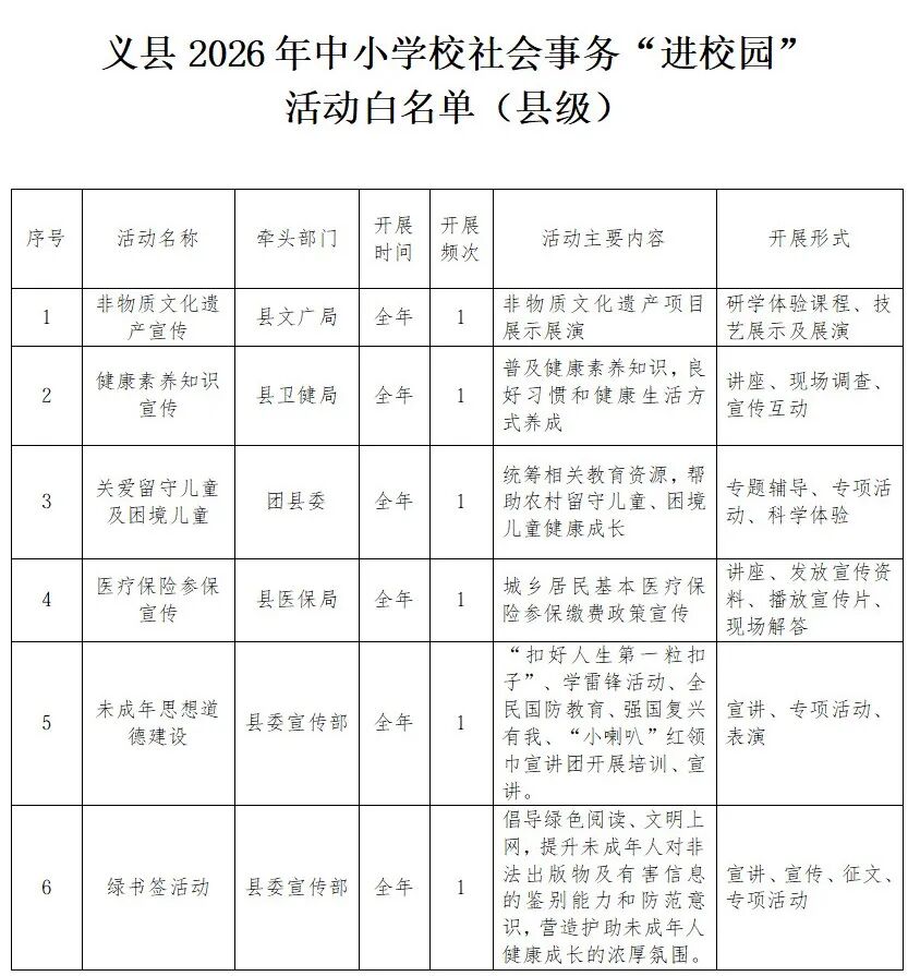 为持续推进整治形式主义为基层减负,按照中央教育工作领导小组秘书组关于开展规范社会事务进校园为中小学教师减负专项整治工作的部署及省、市有关专项整治工作要求,县委教育工作领导小组秘书组结合我县实际制定了《义县2026年中小学校社会事务“进校园”活动白名单(县级)》,现予以公布。